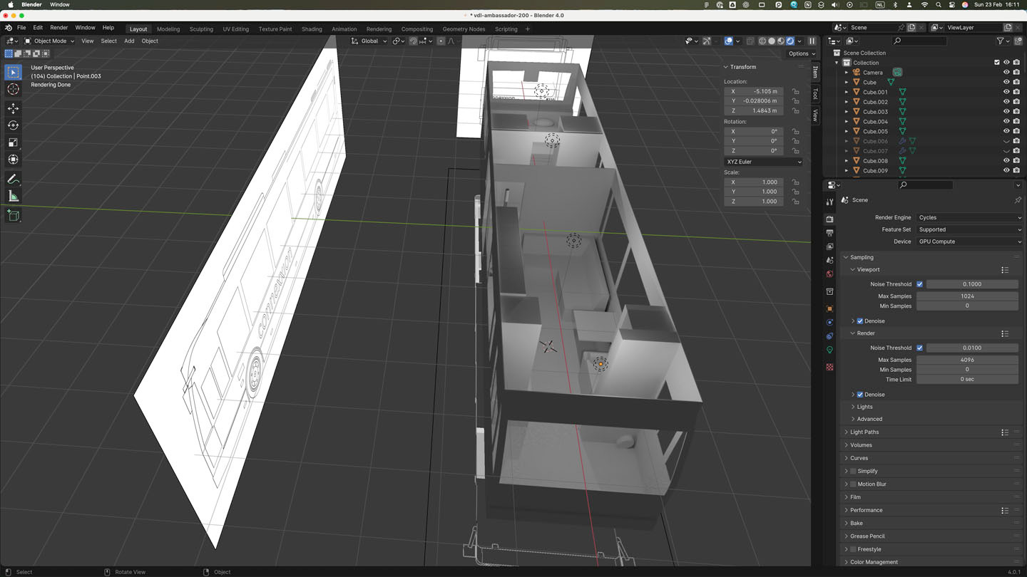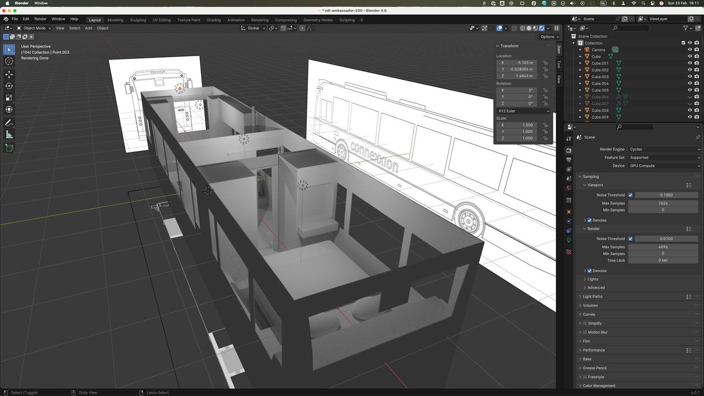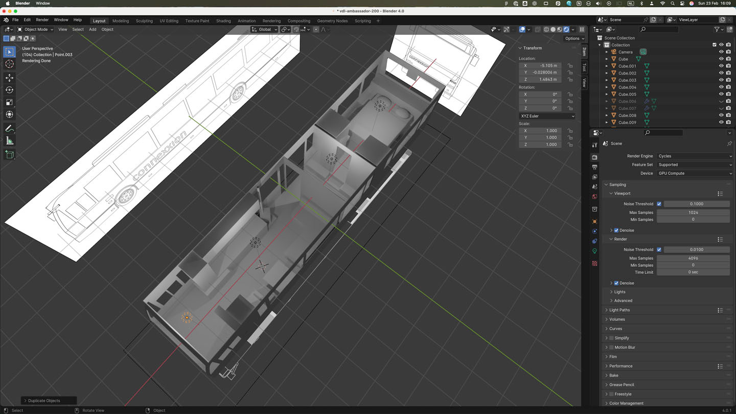 We’re excited to start this project, and we’re already working on some layouts. Here are some quick viewport renders showing a bed and other grey objects: