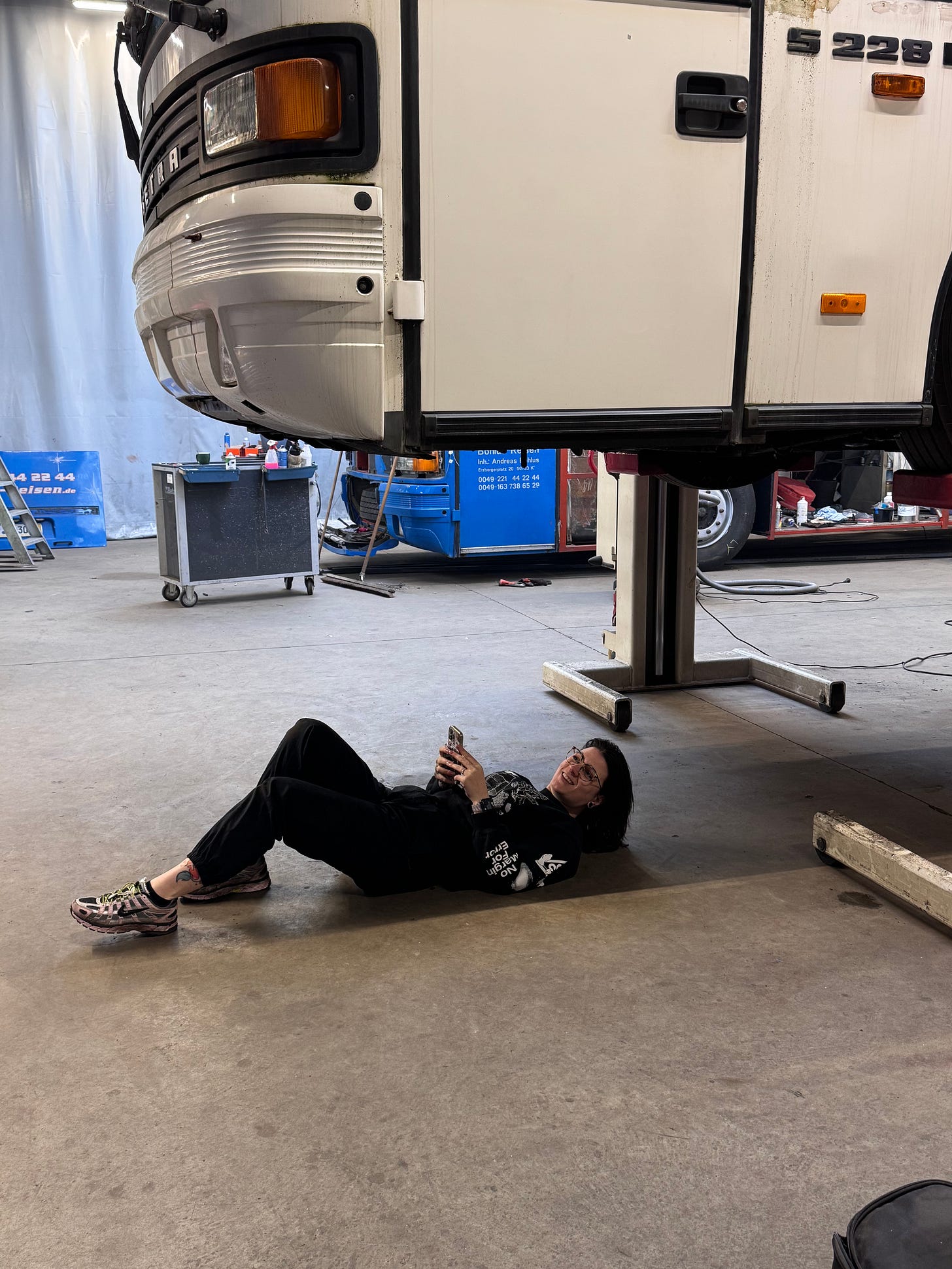 But suitable options turned out few and far between. Ultimately, we settled for a mighty double-decker Setra from the 90s. We even made a down payment, and last week, we visited the dealer for a final inspection. Here’s Kiki “inspecting”: